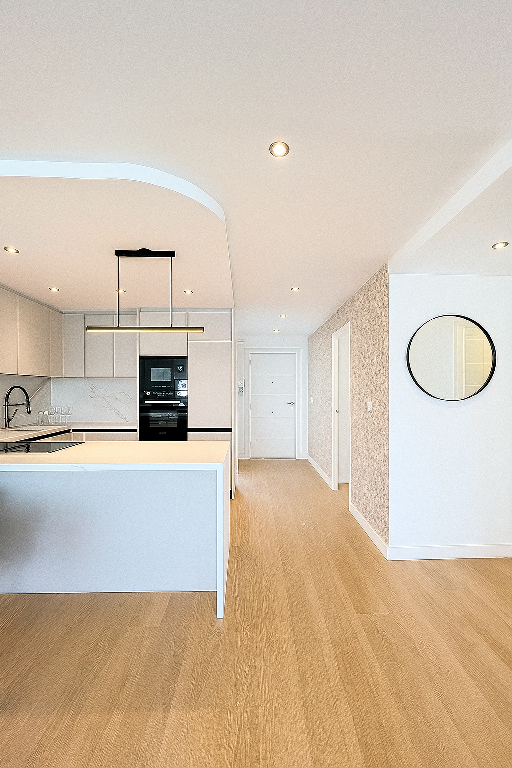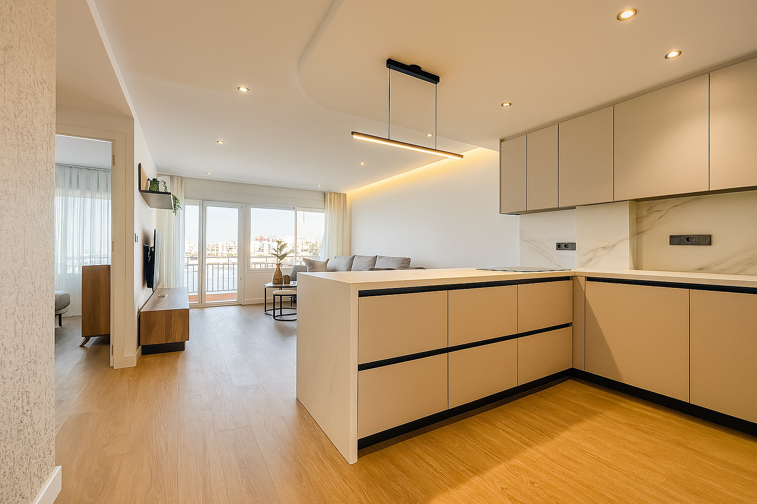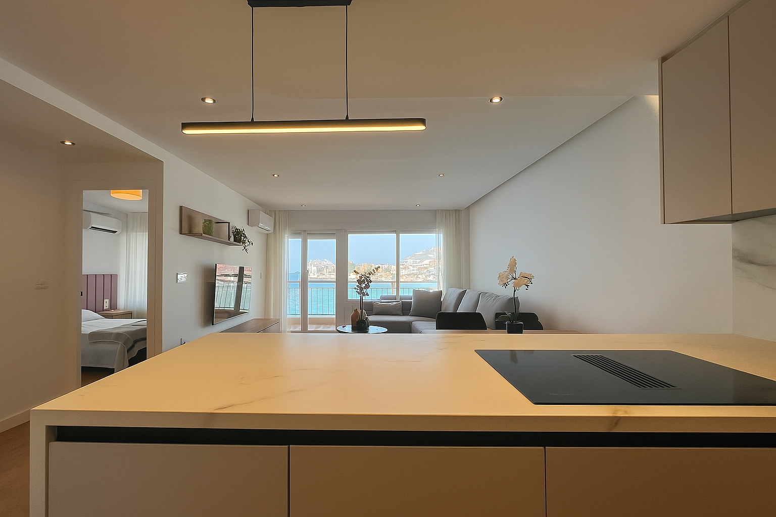 Un proyecto que fusiona diseño contemporáneo y confort mediterráneo. En “Luz del Mar” transformamos por completo la vivienda, optimizando la distribución para abrirla al mar y maximizar la entrada de luz natural. La cocina de líneas puras se integra con el salón en un espacio diáfano que enmarca las impresionantes vistas a la Playa de Los Locos. Materiales cálidos, iluminación estratégica y un interiorismo minimalista crean una atmósfera acogedora y sofisticada, perfecta para disfrutar del mar todo el año.