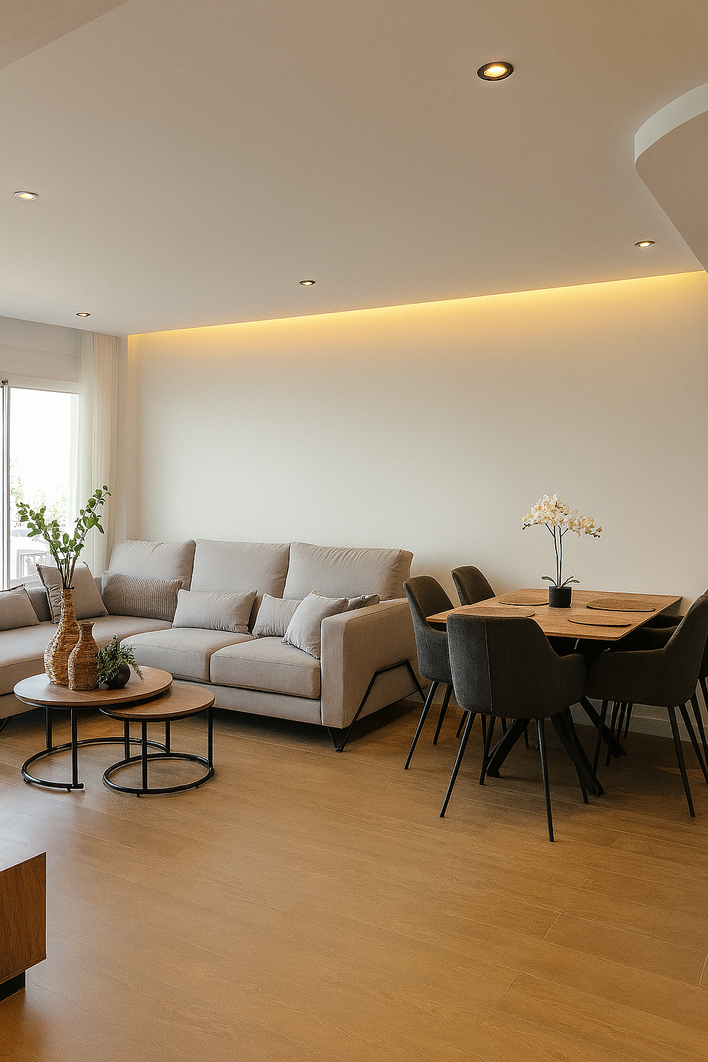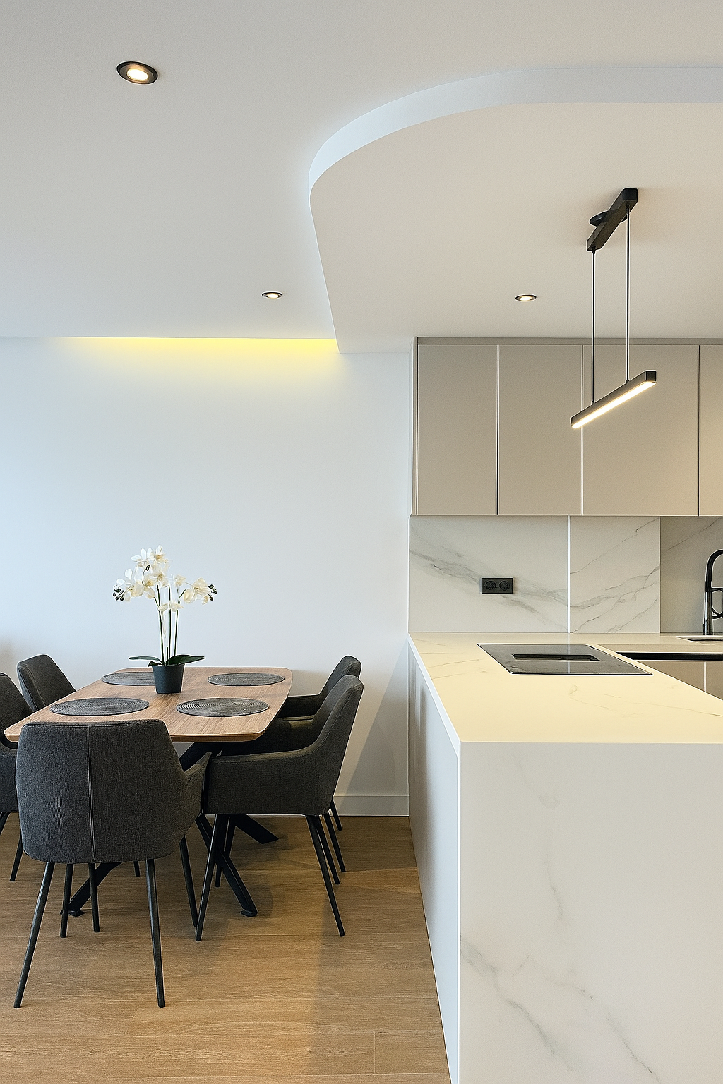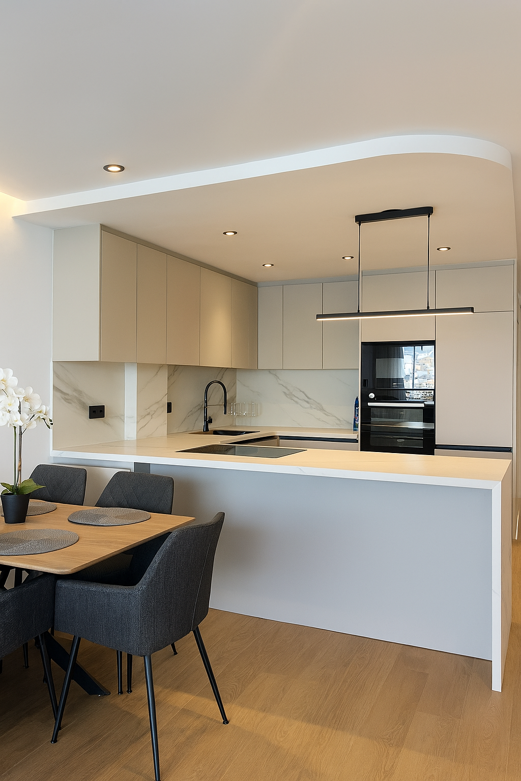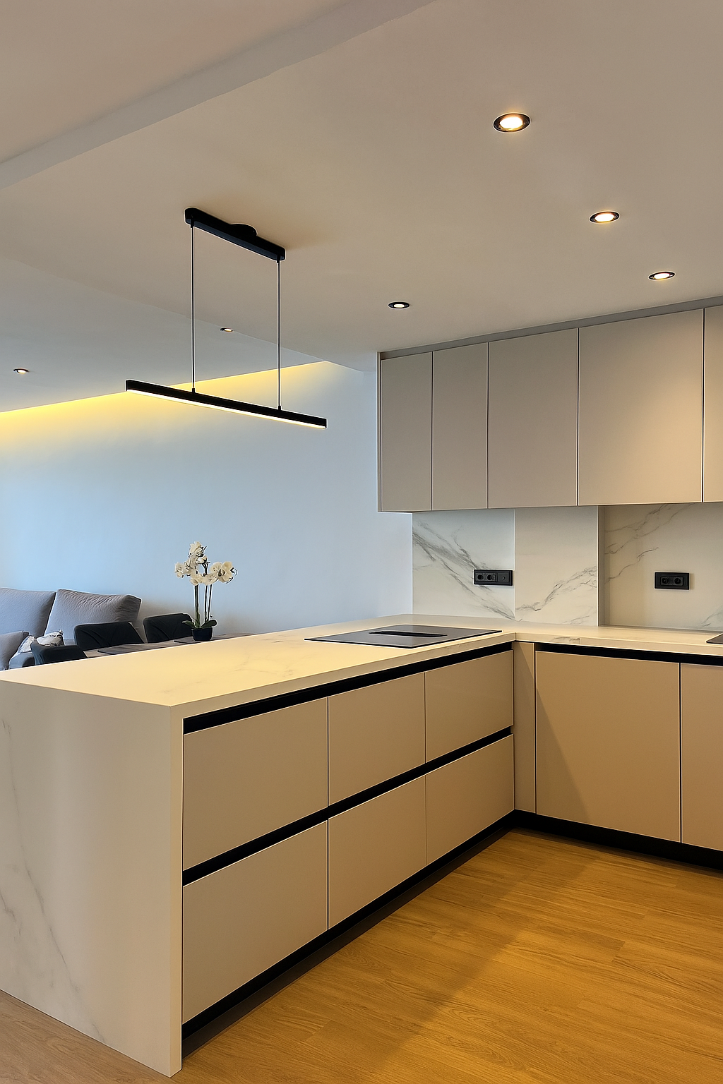 Un proyecto que fusiona diseño contemporáneo y confort mediterráneo. En “Luz del Mar” transformamos por completo la vivienda, optimizando la distribución para abrirla al mar y maximizar la entrada de luz natural. La cocina de líneas puras se integra con el salón en un espacio diáfano que enmarca las impresionantes vistas a la Playa de Los Locos. Materiales cálidos, iluminación estratégica y un interiorismo minimalista crean una atmósfera acogedora y sofisticada, perfecta para disfrutar del mar todo el año.